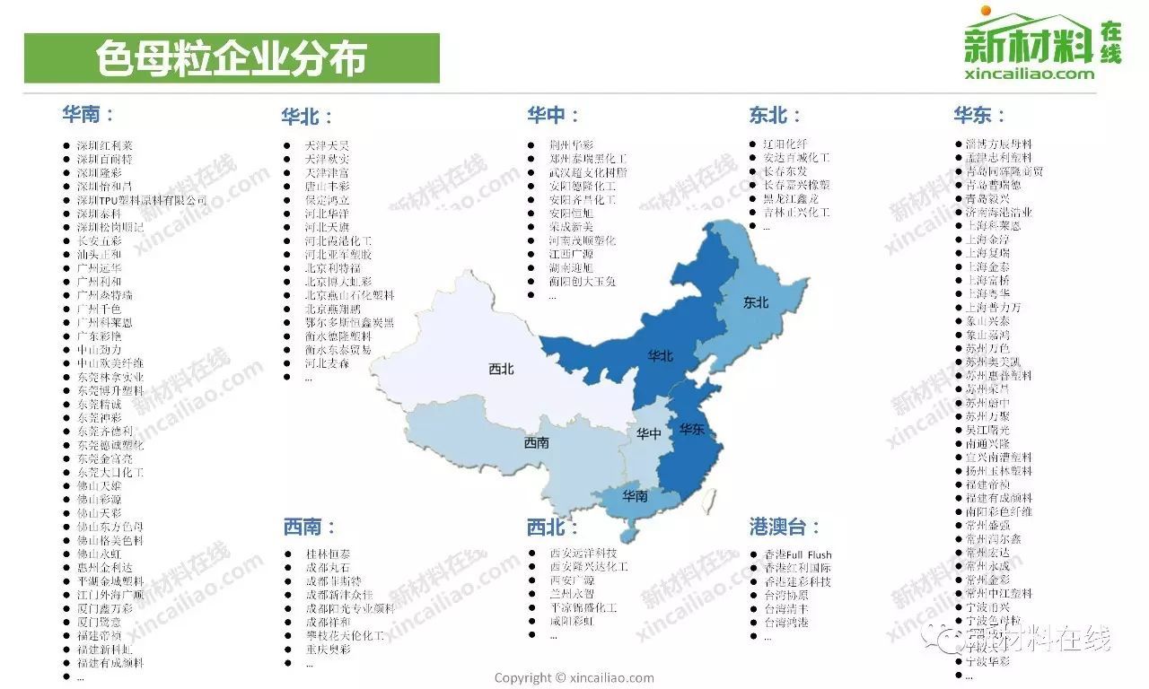 经过多年的发展,我国已经成为亚洲地区色母粒市场大的生产国和消耗国,拥有国有、民营、外资、合资等多种形式的色母粒生产企业上千家,且呈现较强的区域性特征,企业主要分布在珠三角、长三角和环渤海三大区域,这三个区域也是我国家电、汽车、包装等产品加工工业发达的地区。这些色母粒企业规模各异,其中大多数为中小型企业,构建了中国色母粒市场的格局。