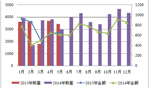 从上图的月度统计可以看出:2015年2月份出口数量远高于2014年同期水平,而到了3月份出口数量同比情况则与2月完全相反,因此总体而言前5月出口数量变化不大。而金额方面的同比差异则表现在2月,2015年2月的出口金额远高于2014年的同期水平。