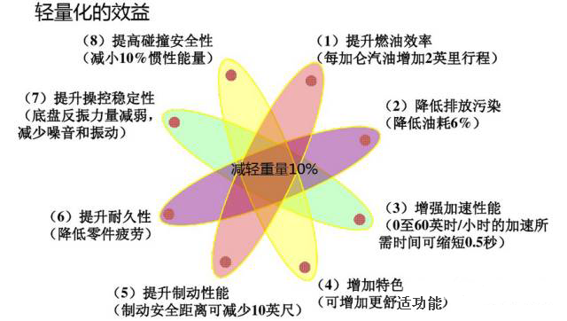 对于汽车的轻量化,主要从汽车设计、改进制造工艺、提高现有材料强度、采用轻质材料替代现有材料四个方面入手,采用轻质材料替代现有材料是当下发展的主要方向。