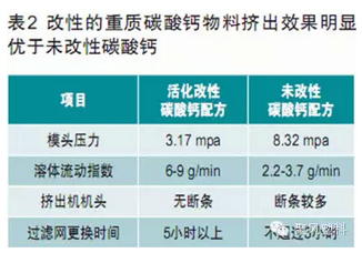 从表1可以看出来经过活化改性后的碳酸钙吸油量比改性前明显降低,未改性的重质碳酸钙是疏油的,但经改性处理后的重质碳酸钙其表面性能变为亲油性,这说明了改牲后的重质碳酸钙在有机质中的分散性好,与聚烯烃的相容性提高,改善了其流动性,大大改善了加工工艺条件。所以应选择改性后的重质碳酸钙为制作BOPP珠光母料的主要原料。